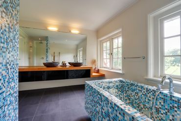 De masterbadkamer beschikt over een ligbad, een ruime rainshower en een dubbele wastafel. Daarnaast is er een ensuite badkamer met douche, wastafel en toilet.