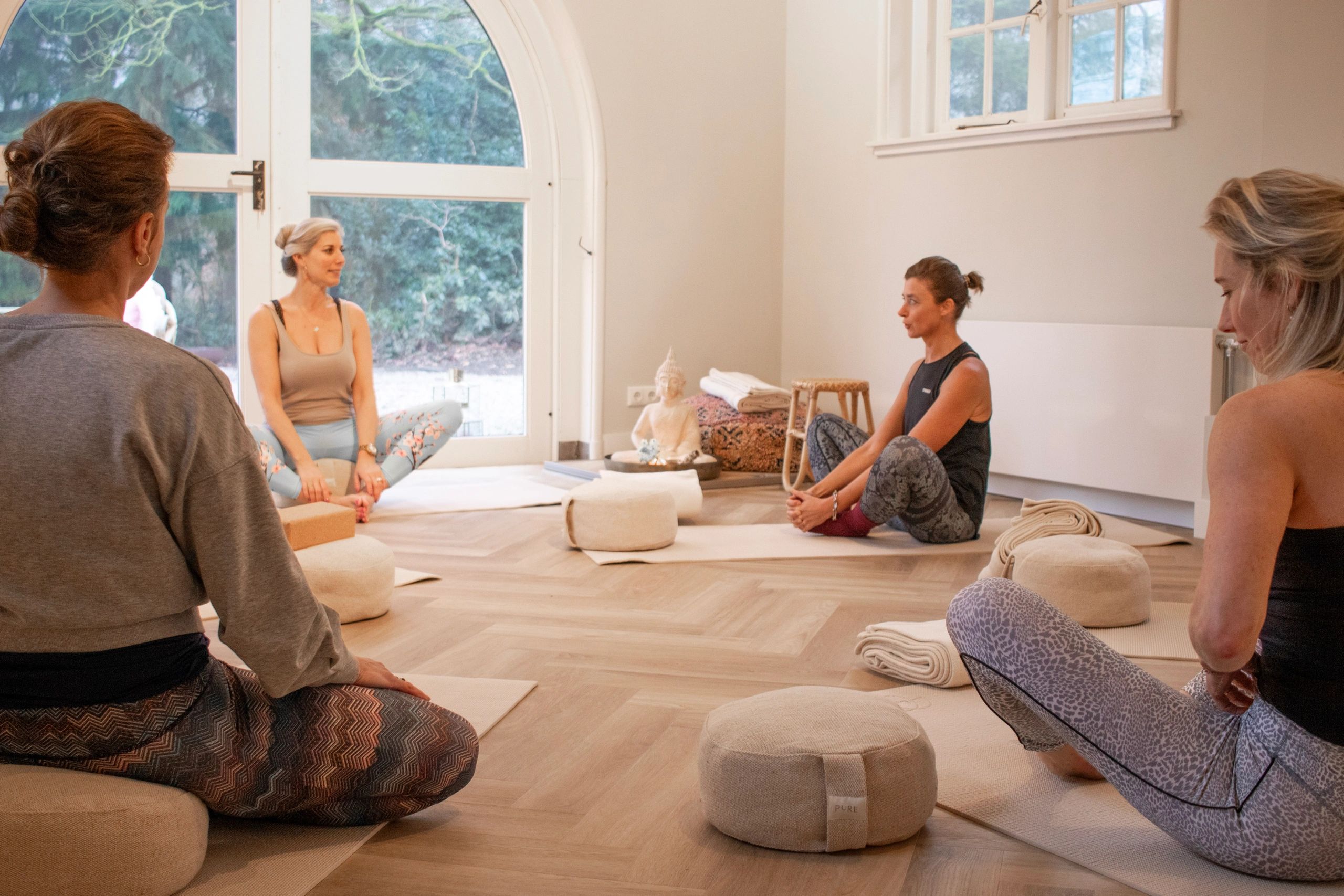 In het landhuis vind je een kleine en lichte yoga- en meditatieruimte die veelzijdig inzetbaar is. Het is een intieme plek, met openslaande deuren en uitzicht op het groen en de vuurschaal. Ideaal voor yoga, meditatie of kleine groepssessies (max 8 personen liggend). De warme inrichting en rustige sfeer maken dat deelnemers zich direct veilig en geborgen voelen.