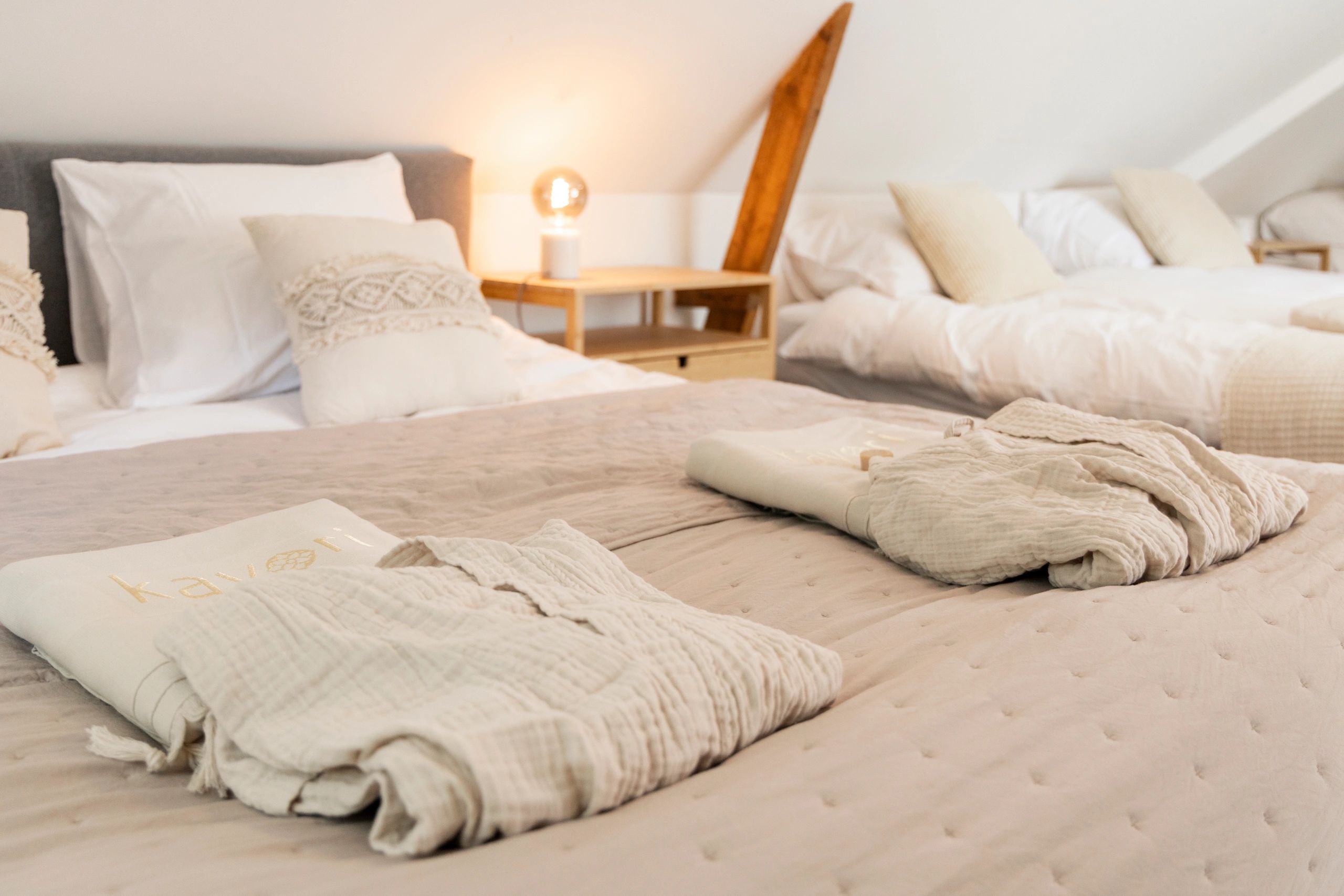 Het huis heeft 11 bedden in 5 slaapkamers op twee verdiepingen (vijf 2-pers bedden en zes 1-pers bedden). Geschikt voor 11 gasten (uit te breiden tot 16 bij gedeeld gebruik). Je slaapt onder biologisch beddengoed en op Yumeko-kussens van gerecycled dons. Voor facilitators is er eventueel een aparte camper beschikbaar.